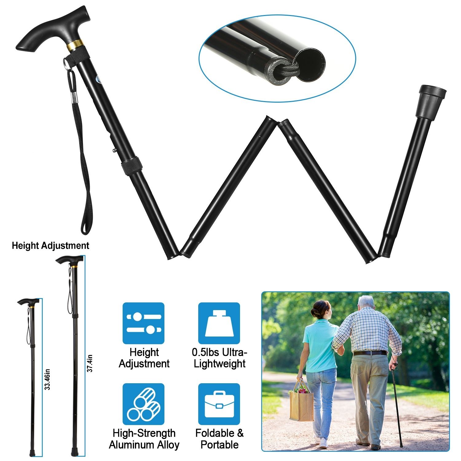 * ULTRA-LIGHTWEIGHT&PORTABLE FOLDING CANE: Made from high-grade aluminum alloy materials, our walking cane is corrosion resistant, rust resistant, high strength but ultra-lightweight (only weights 0.51bs), and adopting foldable design, it can be folded as 4 sections with 10.43in long, 6.7in wide and 1.38in high dimension for conveniently storage on you walk bag, travel bag and carrying-on luggage.